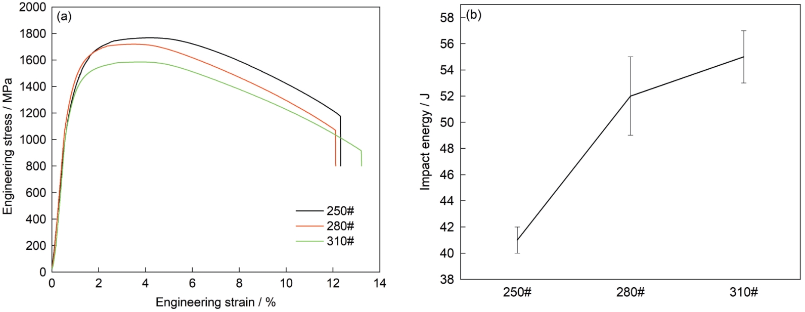 | Fig.8 Engineering stress-strain curves (a) and U-shaped notch impact absorption energy (b) of tested steel after isothermal quenching at different temperature |