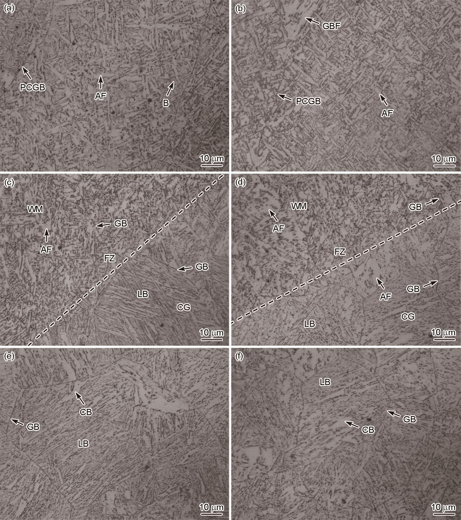 | Fig.4 OM images of non-preheating and low preheating temperature butt joints (dashed line indicate boundary of fusion zone, the same below) (a, b) weld metals, (c, d) fusion zones, (e, f) coarse grain regions in HAZ (FZ—Fusion zone, CG—Coarse grain region, GBF—Grain boundary ferrite, PCGB—Prior columnar grain boundary, AF—Acicular ferrite, B—Bainite, LB—Lath bainite, CB—Coalesced bainite) |