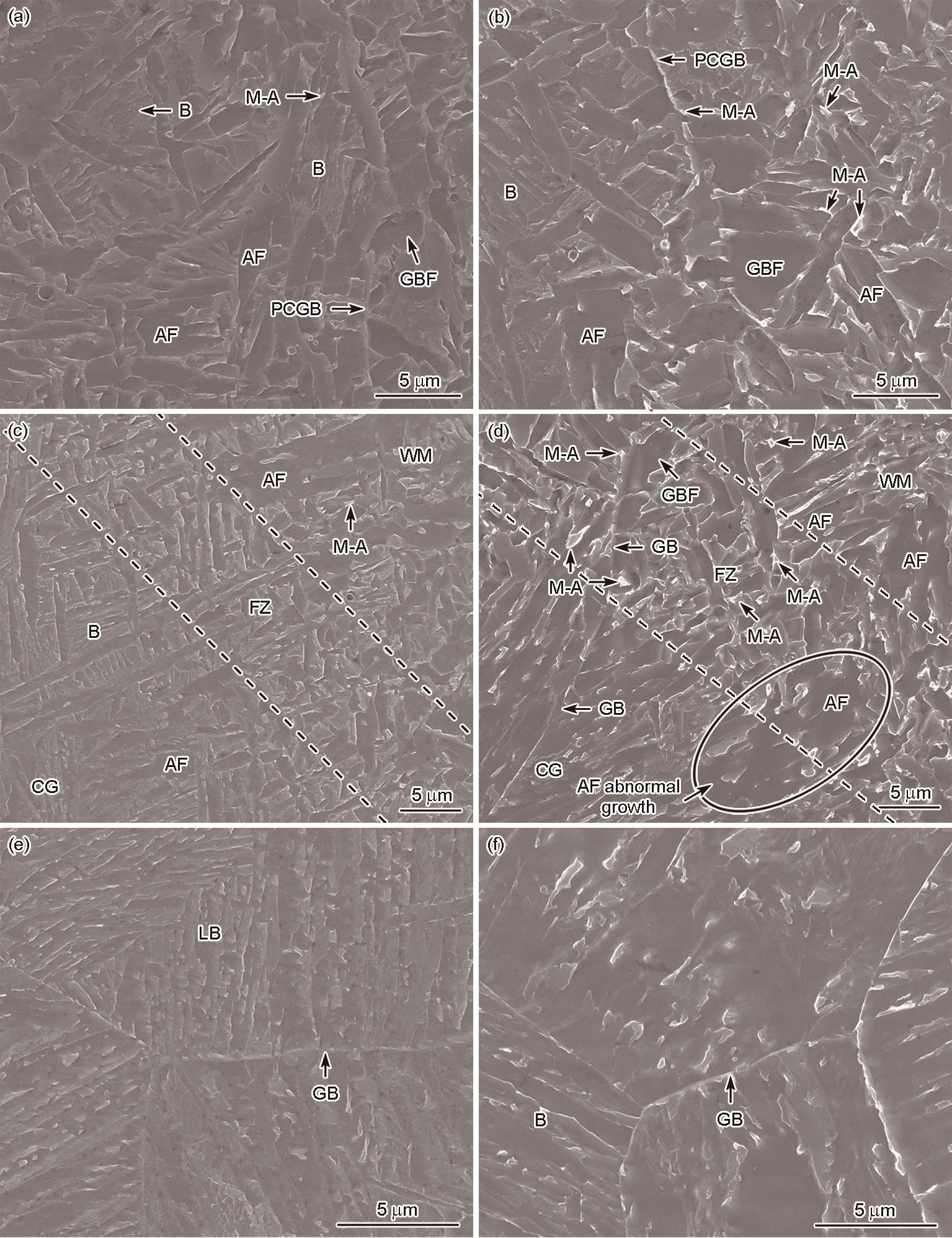 | Fig.6 SEM images of non-preheating and low preheating temperature butt joints (dashed lines indicate fusion zone regions, the same below) (a, b) weld metals, (c, d) fusion zones (circle indicates abnormal growth of acicular ferrite), (e, f) coarse grain regions in HAZ |