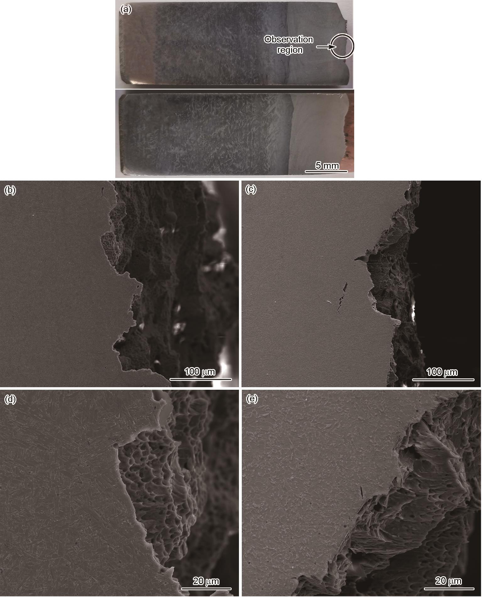| Fig.9 Observation region of impact fracture side (a) and SEM images of impact fracture side of weld metals for non-preheating (b, d) and low preheating temperature (c, e) |