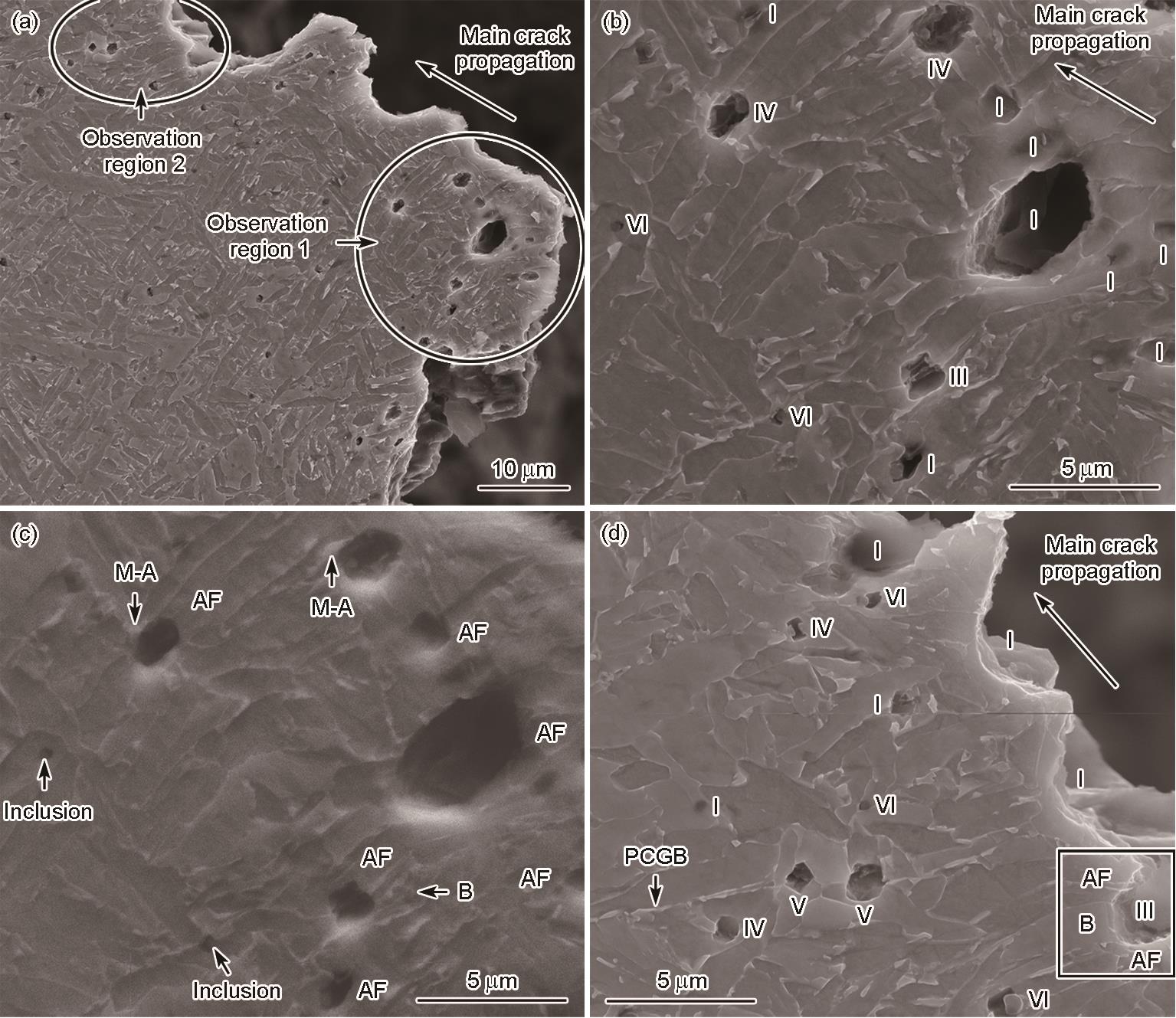 | Fig.10 SEM images of micro-voids and main crack of impact fracture of weld metal in non-preheating welding (Fig.10c is backscattered electron (BSE) image, the others are secondary electron (SE) images, I—micro-voids appeared in AF, II—micro-voids appeared in B, III—micro-voids formed around AF and B interface, IV—micro-voids formed around M-A and AF interface, V—micro-voids formed at grain boundary, VI—micro-voids formed around inclusions, the same I~VI below) (a) SEM image of impact sample center (solid circles indicate observation regions), (b, c) observation region 1 in Fig.10a, (d) observation region 2 in Fig.10a (solid rectangle indicate deflection of main crack) |
