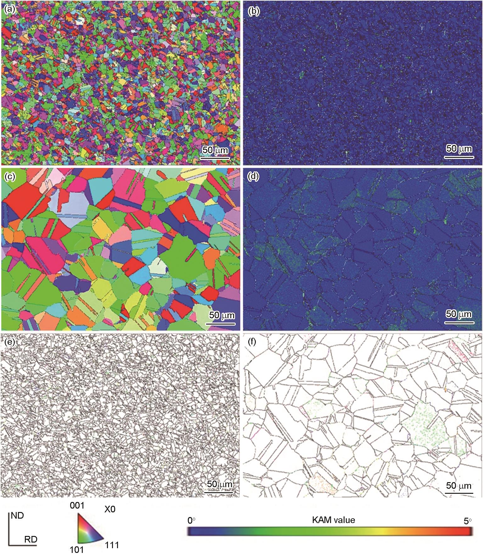| Fig.3 EBSD-IPF (a, c), EBSD-KAM (b, d) and IPF of δ-ferrite (e, f) maps of the FG (a, b, e) as well as CG (c, d, f) tested steels |