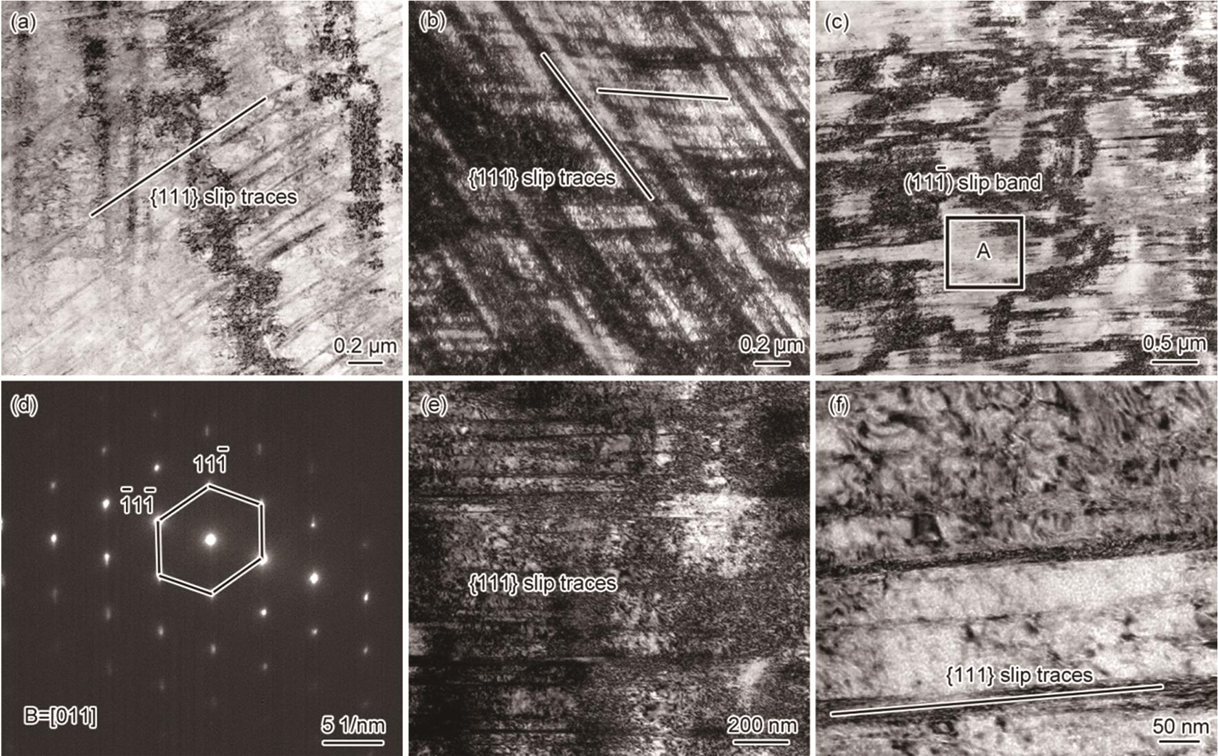 | Fig.7 Typical TEM images of the FG steel after tensile deformation at -196 oC. (a, b, c, e, f) Bright-field TEM images. (d) Selected area electron diffraction patterns obtained from the outlined region A in Fig.7c |