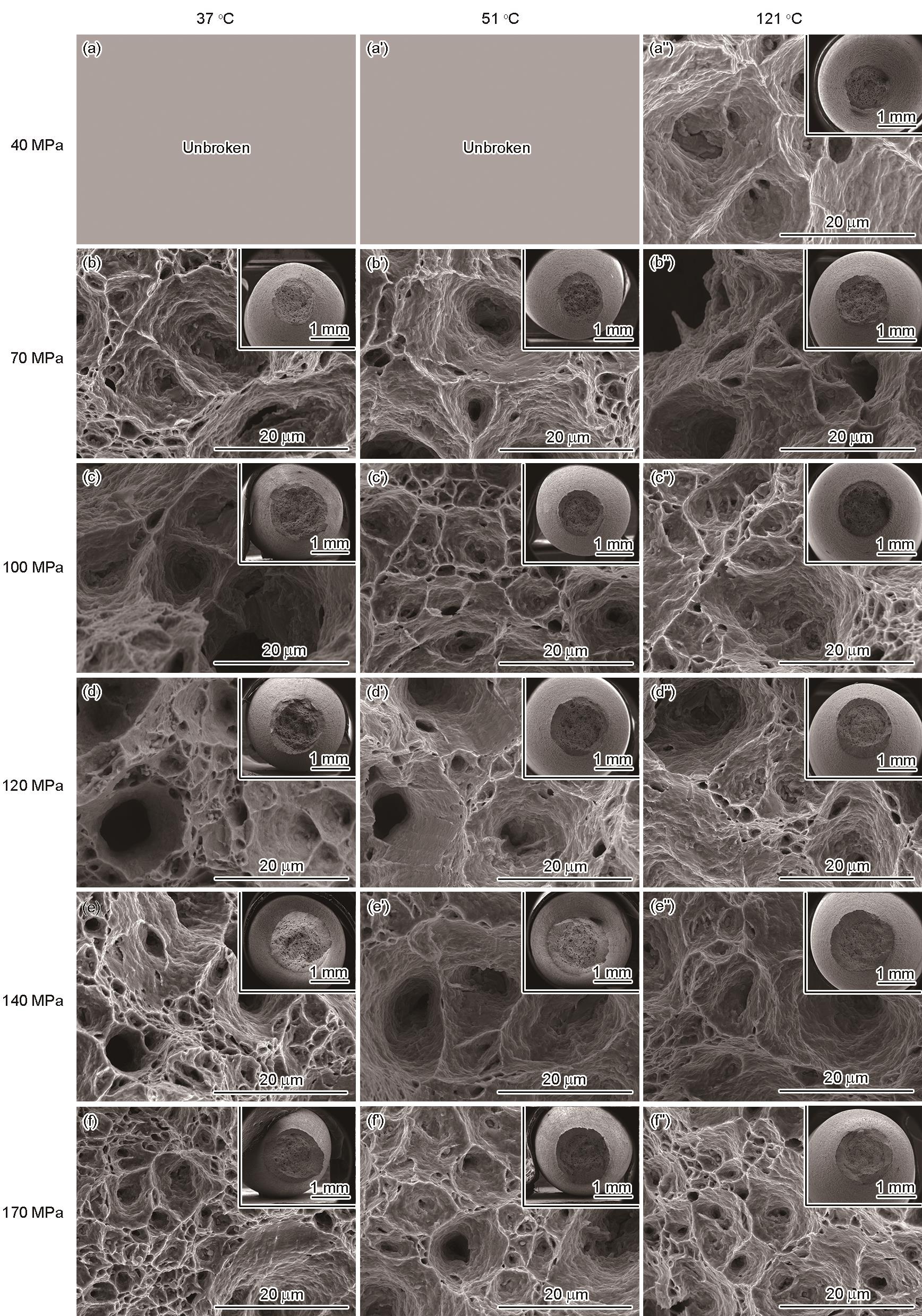 | Fig.7 Fracture morphologies of Zn-0.45Mn alloy after creep rupture under various stresses at 37 oC, 51 oC, and 121 oC (No rupture occurred after 1000 h of creep at 37 oC and 51 oC under 40 MPa) |