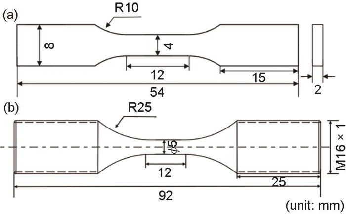 Schematic diagram of the shape and size for tensile samples (a) and high-cycle fatigue samples (b)