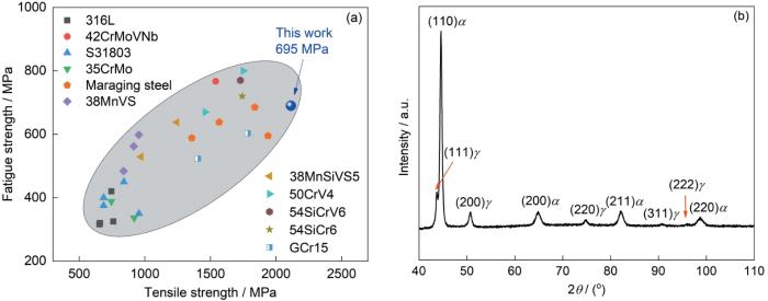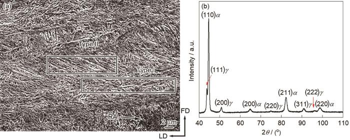 Microstructure (a) and XRD pattern (b) of experimental steel