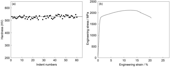 Vickers hardness diagram (a) and tensile engineering stress-strain curve (b) of experimental steel