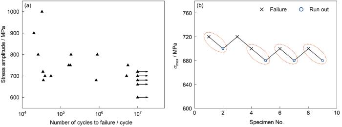 S-N curve (a)and fatigue strength test staircase method diagram (b) of experimental steel