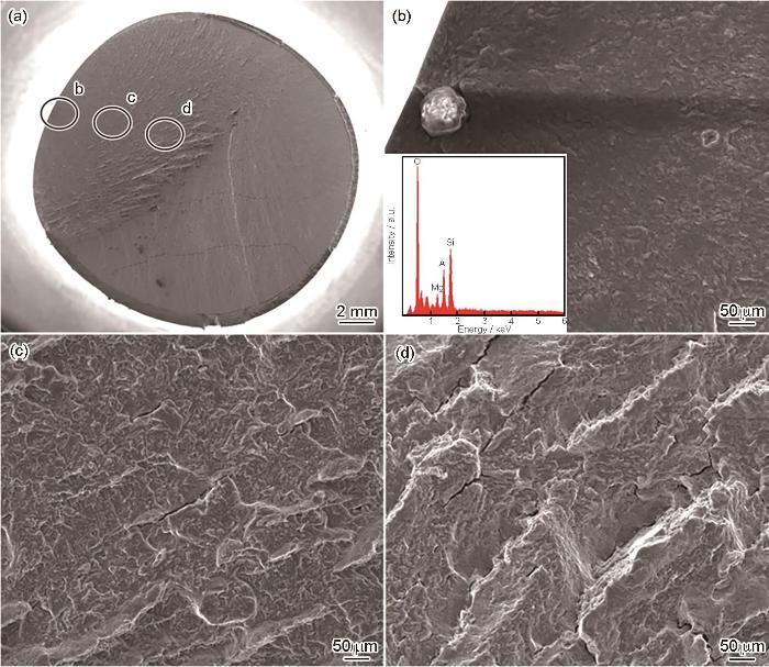 Fatigue fracture morphology of surface inclusion-induced cracking at different propagation stages (a) macroscopic fracture morphology, (b) microstructural characteristics of crack origin and associated inclusion chemistry, (c) morphology of the crack steady-state propagation zone, (d) morphology of the crack rapid propagation zone