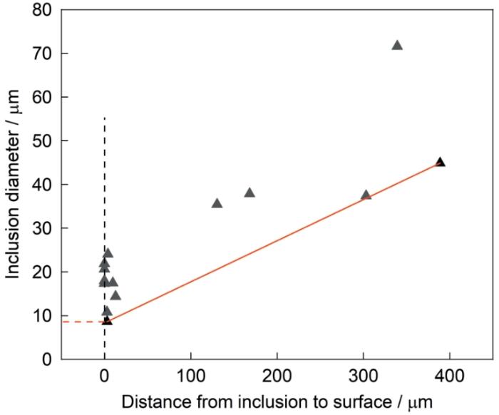 本文的实验用钢倾向于从大尺寸夹杂物开裂,比小尺寸夹杂物更有害[25]。夹杂物的尺寸存在一个临界值,称为“临界夹杂物尺寸”。疲劳裂纹不会从小于临界尺寸的夹杂物处萌生。Murakami等[34]和Atkinson等[35,36]分别提出两种统计学方法即统计极值法和广义帕累托分布法,估算一定体积的钢中夹杂物的最大尺寸。结果表明,疲劳开裂临界夹杂物尺寸随着夹杂物到试样表面深度的增大而增大[37]。外推法[31]是一种估算疲劳开裂临界夹杂物尺寸的方法,图9给出了用外推法估算的这种中锰钢裂纹源夹杂物尺寸与夹杂物距表面深度的关系。结果表明,夹杂物到试样表面的深度越小则夹杂物的尺寸越小。用外推法测得这种中锰钢的临界夹杂物尺寸为8.6 μm,高于超高强度钢42CrMoVNb的7.3 μm临界夹杂物尺寸[31]。