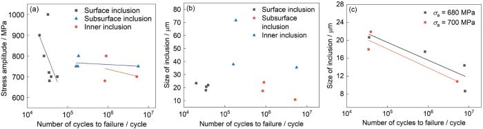 Effect of inclusion location and size on fatigue performance (a) S-N curves for inclusions at different locations, (b) statistical distribution of inclusion sizes, (c) relationship between inclusion size and fatigue life at constant stress amplitude