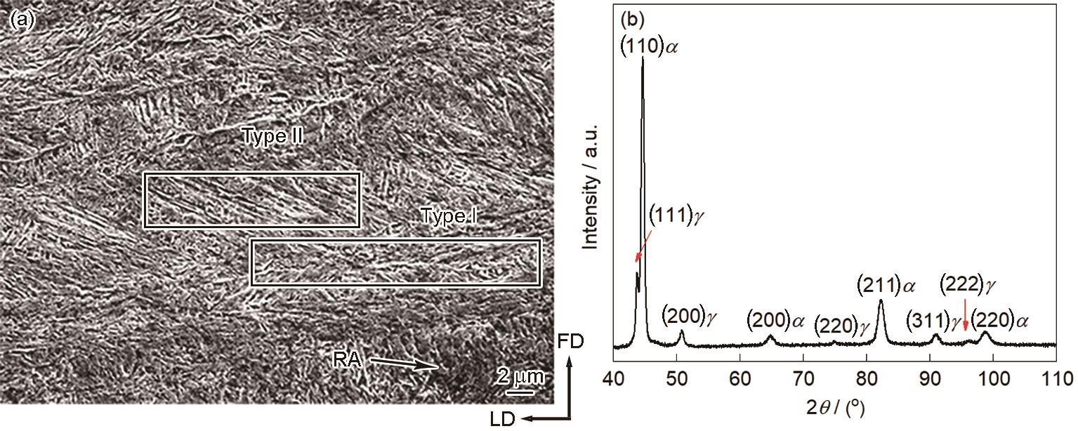 | Fig.2 Microstructure (a) and XRD pattern (b) of experimental steel |