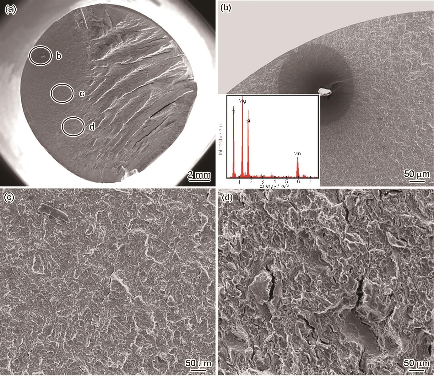 | Fig.7 Fatigue fracture morphology of internal inclusion-induced cracking at different propagation stages (a) macroscopic fracture morphology, (b) microstructural characteristics of crack origin and associated inclusion chemistry, (c) morphology of the crack steady-state propagation zone, (d) morphology of the crack rapid propagation zone |