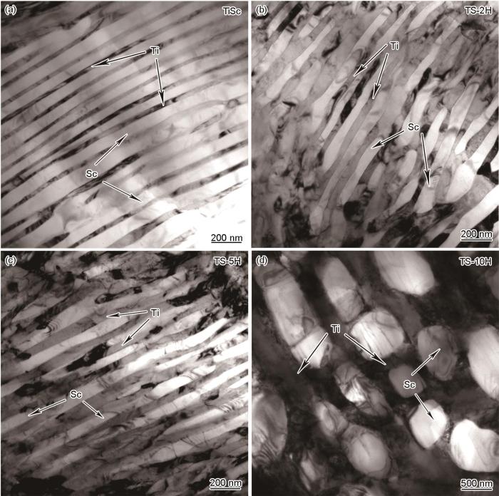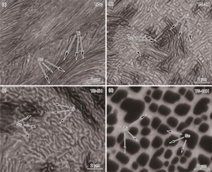 图1给出了不同Hf元素含量TiSc合金的SEM-BSE图像。可以看出,4种试样中均有由α-Ti相(灰白色)和α-Sc相(黑色)交替分布(图中箭头标出)构成的调幅分解结构。未掺杂Hf元素的TiSc合金中Ti、Sc片层组织高度细化,沿着同一方向排布,表明其倾向于形成高度有序的调幅分解结构。Hf元素的添加,使TiSc合金的调幅分解发生了变化。从图1b可见,TS-2H试样中α-Ti与α-Sc片层的宽度增加。随着Hf含量提高到5% (图1c),α-Ti和α-Sc两相组织进一步粗化,α-Ti形成局部连通的网状结构将α-Sc包裹。在Hf含量为10% (图1d)的试样中α-Ti形成了连续的网格状组织,而α-Sc则转变为圆角方块状。