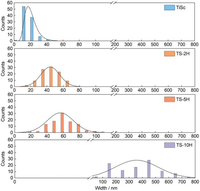 不同Hf元素含量TiSc合金中Ti片层宽度的分布