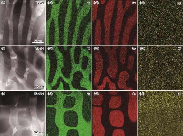 (2) Hf元素在TiSc合金中的均匀固溶使α-Ti和α-Sc调幅分解结构由片层转变为网格状与块状组织。低扩散性Hf元素的掺杂降低了合金体系的扩散速率,改变了调幅分解组织的形貌特征。