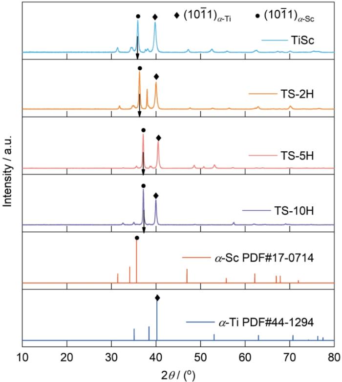对TiSc母合金和原子分数分别为2%、5%和10%的Hf元素进行电弧熔炼,制备TiSc-Hf合金锭,记作TS-xH (x = 2, 5, 10)合金。将TS-xH合金锭真空封管,进行均匀化热处理和淬火处理,温度和时长与母合金锭的热处理参数相同。
