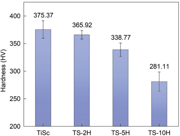 图7给出了不同Hf元素含量TiSc合金的维氏硬度。可以看出,合金的硬度与Hf含量呈负相关:未掺杂Hf元素的TiSc合金的平均硬度为375.37HV;掺杂2%Hf元素的TS-2H合金的平均硬度降低到365.92HV;TS-5H合金的平均硬度进一步降低到338.77HV;Hf元素含量为10%的TS-10H合金,其维氏硬度降低到281.11HV。这表明,掺杂Hf元素使TiSc合金的调幅分解组织粗化而导致合金的硬度降低。