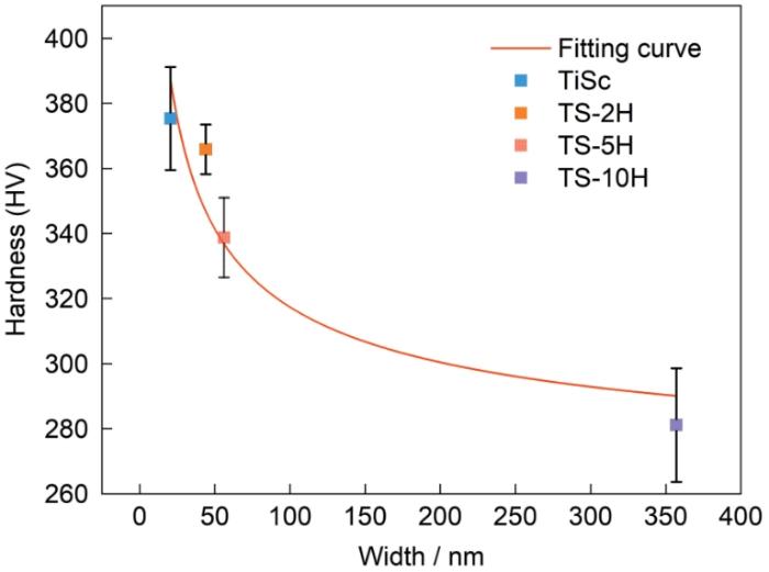 图2给出了不同Hf元素含量TiSc合金的微观结构。可以看出,在TEM-BF像中Ti和Sc两相的衬度与扫描电镜背散射电子成像结果不同:α-Ti呈现黑色,而α-Sc呈现灰白色(图2中箭头所示)。从Ti片层宽度的统计图(图3)可见,随着Hf含量的提高TiSc合金中Ti片层(Sc片层与Ti片层宽度接近)的宽度显著增大。未掺杂Hf元素的Ti片层(图2a)的平均宽度为20.50 nm,TS-2H试样(图2b)中Ti片层的平均宽度为44.02 nm。Hf含量提高到5%,Ti片层的平均宽度增大到56.11 nm (图2c);Hf含量为10%时网格状Ti组织的平均宽度显著增大到357.03 nm (图2d),且Ti组织宽度的分布范围较广。