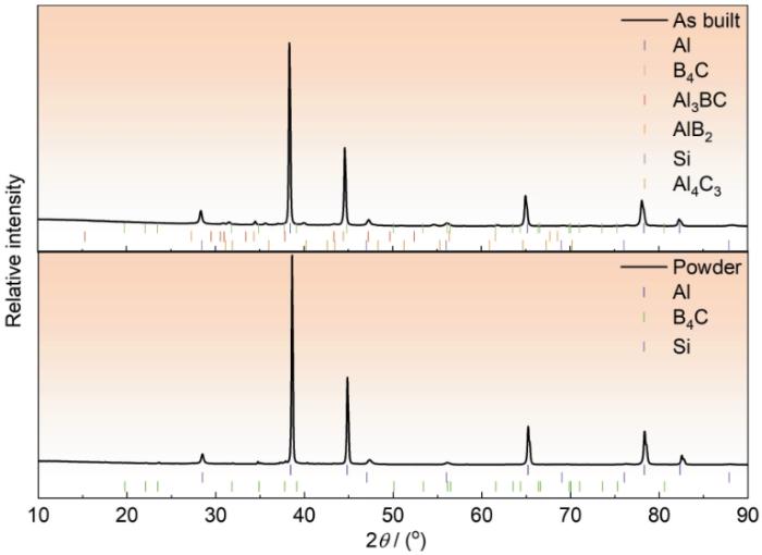 图3给出了B4C/AlSi10Mg复合材料粉末和打印态样品的XRD谱。可以看出,与复合材料粉末相比,LPBF打印成形时B4C与基体发生反应生成了Al3BC相和AlB2相。其原因是,在LPBF打印过程熔池中心温度高达1800 ℃,液/固界面的B4C优先吸热,Al基体对激光反射率高,从激光束吸收的热量较少,热量从高温B4C传导到Al基体,这时B4C颗粒与Al发生激烈的相互作用。优先吸热的B4C颗粒溶解在Al中并分解为B和C,使B4C与Al基体发生界面反应生成针状Al3BC相和AlB2相。