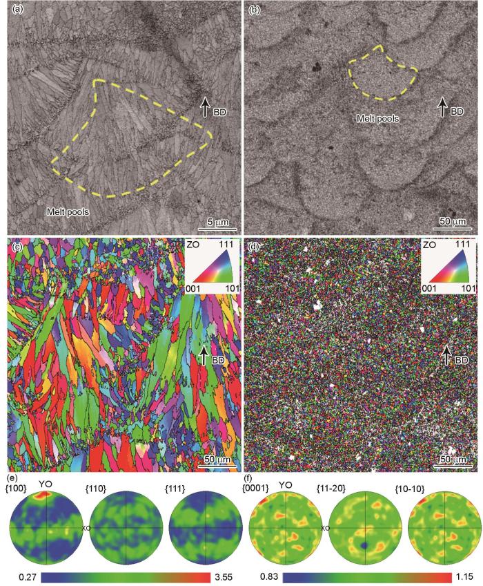 SEM images (a, b), EBSD images (c, d), and pole figures (e, f) of AlSi10Mg alloy (a, c, e) and B4C/AlSi10Mg composite (b, d, f)