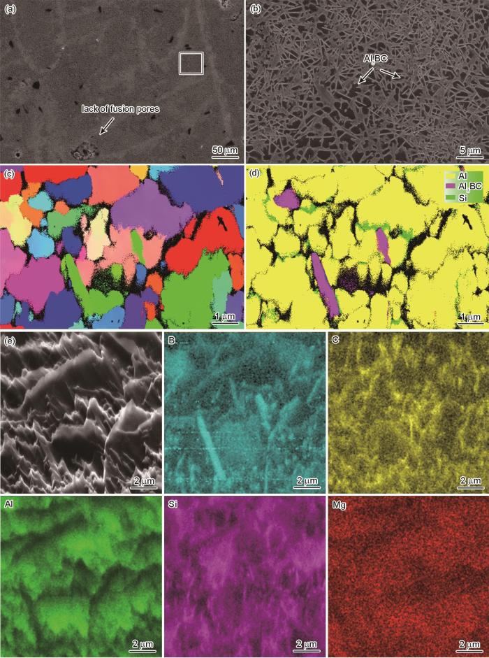 根据等效圆面积法的计算结果表明,B4C/AlSi10Mg复合材料的平均晶粒尺寸为2.69 μm,比AlSi10Mg合金的晶粒(平均晶粒尺寸为17.27 μm)显著细化。这种等轴细晶的组织使材料的力学性能各向同性和强度显著提高。B4C颗粒的异质形核、熔体流动与热传导的改变、成分过冷效应、机械搅拌以及凝固过程中的应力与应变,共同促进了晶粒的细化和等轴晶的形成,从而显著改善了材料的微观结构和性能。从图5d可见,Al晶粒的细化伴随着晶界数量的明显增加。这些增加的晶界不仅阻碍位错运动,还在拉伸过程中为应变提供容纳空间,从而使材料的力学性能提高。