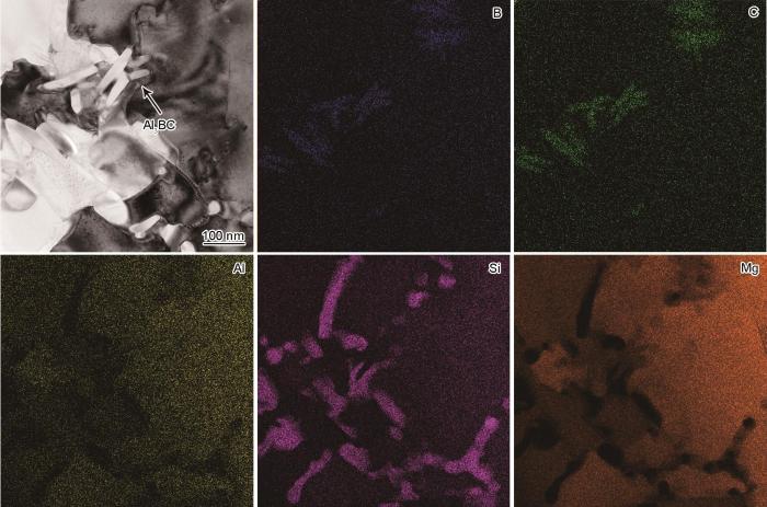 图7给出了B4C/AlSi10Mg复合材料中Al3BC相的透射电镜(TEM)照片和EDS能谱分析结果。B4C/AlSi10Mg复合材料中的Al3BC相呈现长杆状形貌,其典型长度约为200~300 nm。对物相分布的分析发现,Al3BC主要沿B4C-Al界面生长并延伸到Al基体内。其原因是,LPBF工艺具有高速凝固特性:在加工过程中极高的冷却速率限制了B4C与Al之间的界面反应动力学,使Al3BC相难以充分生长。