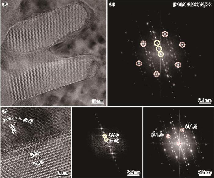 图8给出了Al3BC相和Al基体的晶体学特征分析。图8a给出了Al3BC[100]和Al[110]晶带轴的高分辨透射电镜(HRTEM)照片,图8b给出了Al3BC[100]和Al[110]晶带轴下的选区电子衍射(SAED)谱,图8c给出了Al3BC[100]和Al[110]晶带轴下HRTEM图像的高速Fourier变换(FFT)结果。Al3BC形貌中的长轴对应Al3BC晶体结构中的[001]晶向,而短轴对应[100]晶向。因此,原位自生的Al3BC相沿着[001]晶向生长。研究发现,Al3BC相与铝基体界面为半共格界面。Al3BC是B4C和Al之间原位反应生成的,界面结合为典型的反应结合。较高的界面结合强度有利于提高复合材料的强度,但是可能使其塑性降低。