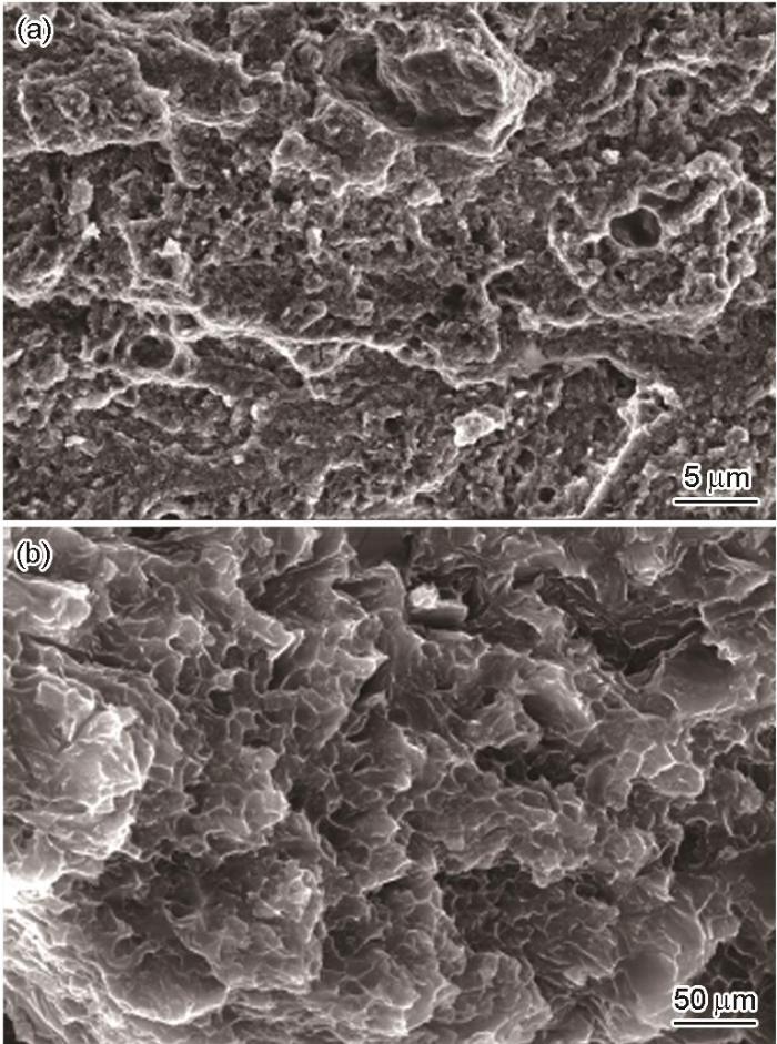 图9给出了B4C/AlSi10Mg复合材料的室温拉伸力学性能。LPBF成形的B4C/AlSi10Mg复合材料抗拉强度为~487 MPa,显微维氏硬度为~192HV。样品较大的脆性使拉伸性能波动较大,但是抗拉强度良好。与文献报道的AlSi10Mg+15%(质量分数)SiC复合材料相比,抗拉强度提高42.4%[21],在打印过程中B4C与AlSi10Mg界面上发生的化学反应生成了结构疏松的脆性相Al4C3相,使基体与增强相之间的界面结合强度降低,削弱了B4C颗粒的强化作用。同时,材料承受拉伸载荷时,这些脆性相和材料内未熔合的空洞和微气孔可能成为裂纹的起始点,使裂纹加速产生和扩散。从图10a,b可以看出,河流状解理面内的断裂面规则平整,B4C颗粒界面附近的微裂纹和韧窝尺寸较小、塑性较低。
