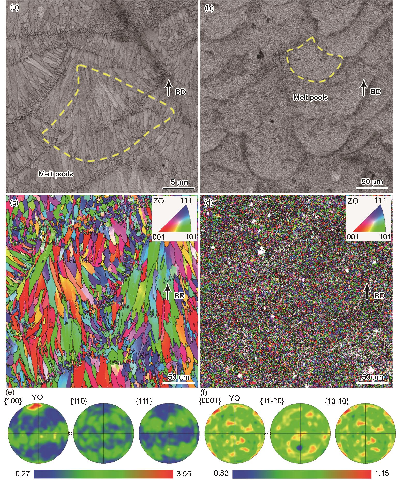 | Fig.4 SEM images (a, b), EBSD images (c, d), and pole figures (e, f) of AlSi10Mg alloy (a, c, e) and B4C/AlSi10Mg composite (b, d, f) |
