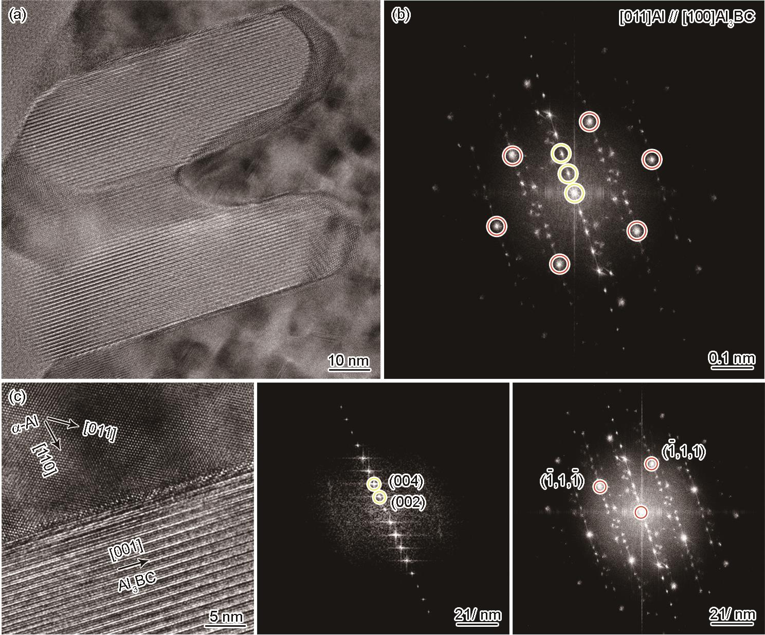 | Fig.8 High-resolution images (a), diffraction patterns (b), and fast Fourier transform (FFT) of the high-resolution images (c) of Al3BC along the [100] zone axis and Al along the [110] zone axis |