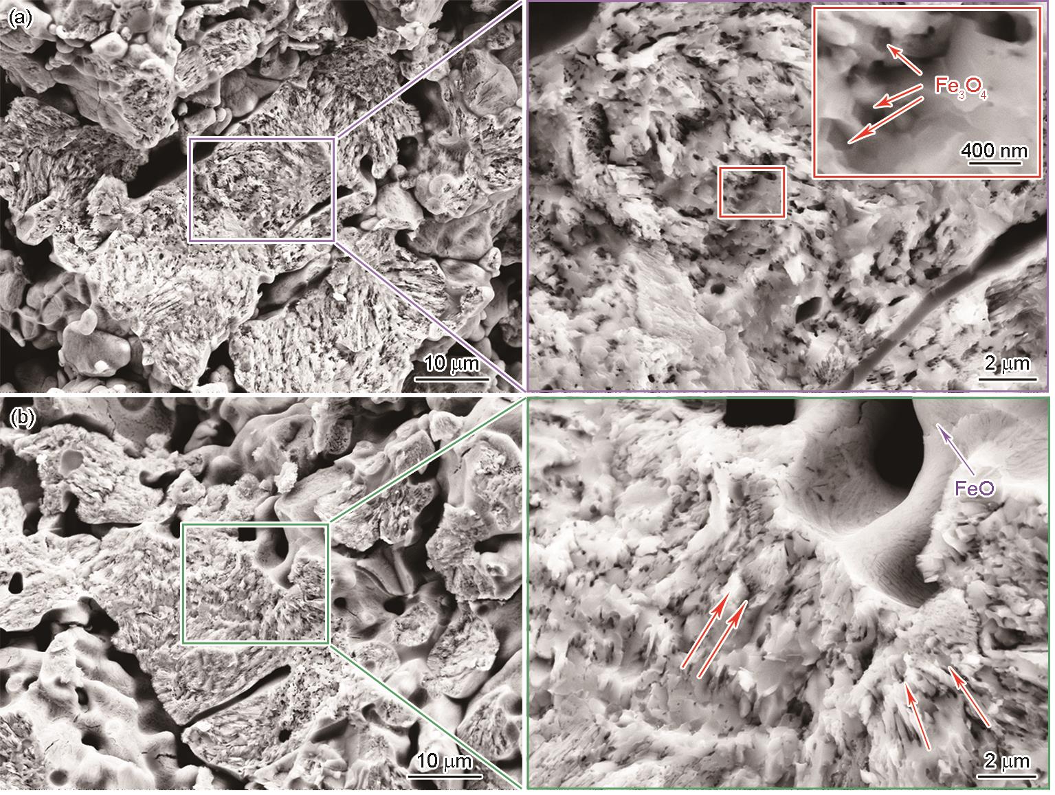 | Fig.3 Cross-sectional morphologies of pellet ore reduced in hydrogen atmosphere at 600 oC for 10 min (a) center region, (b) edge region |