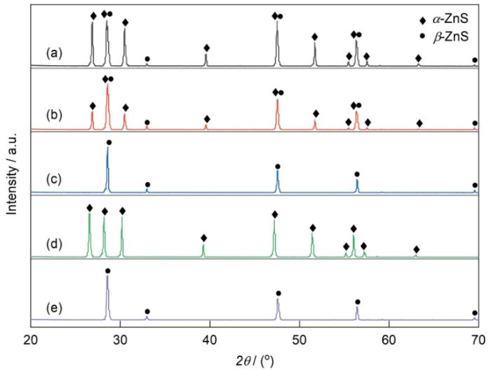 XRD patterns of ZnS transparent ceramics with various amount of additive KX (X = Cl, Br, I): (a) ZnS-A: 0.5%KBr, (b) ZnS-B:1.5%KBr, (c) ZnS-C:3.0%KBr, (d) ZnS-D: 3.0%KCl, (e) ZnS-E: 3.0%KI