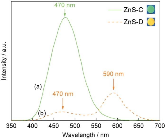 图5给出了在365 nm紫外光激发下ZnS-C(3%KBr)和ZnS-D(3%KCl)陶瓷的光致发光谱。由图5可见,在ZnS-D的谱中590 nm处出现较宽的黄色发光峰(峰位),此黄光是纤锌矿α-ZnS的离子空位与相异缺陷的复合发光[37]。位于ZnS-C样品谱中的470 nm处的绿色发光峰,可归因于闪锌矿β-ZnS中阳离子空位VZn的自激发光[37]。在ZnS-D的谱中470 nm处也出现了较宽的发光峰,是ZnS-D中少量的β-ZnS晶粒所致,与图2给出的XRD谱一致;两个样品都没有近带边发射[38],表明ZnS样品中晶粒的结晶质量显著低于同类单晶。ZnS-D样品的黄色发光意味着其缺陷较多,表明KCl扩散进入了晶格,不能保持在β-ZnS粒子表面稳定其相结构,并最终使六方相得以生成。发光测试结果表明,在烧结过程中KBr未进入ZnS-C陶瓷晶粒的晶格,间接支持了KBr纳米晶抑制六方相α-ZnS生成的机制。