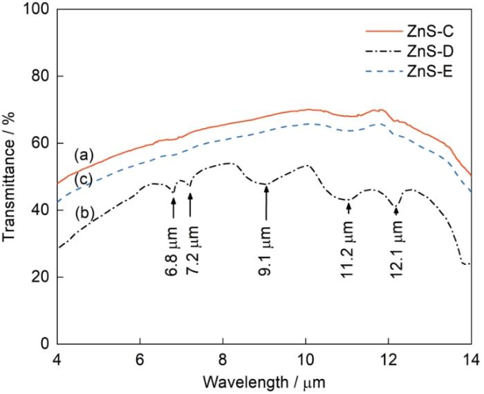 IR spectra of as-sintered ZnS transparent ceramics (a) ZnS-C, (b) ZnS-D, (c) ZnS-E