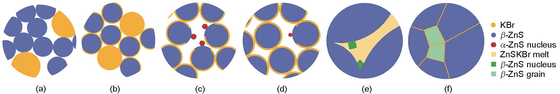 | Fig.4 Schematic illustration of mechanism on inhibiting low-temperature phase transition of ZnS nanocrystals (a) mixture of β-ZnS and KBr, (b) KBr molecular layer via spontaneous diffusion, (c) KBr liquid molecular layer and α-ZnS nucleus on ZnS nanopartical surface, (d) ZnSKBr melt dissolving α-ZnS nuclues, (e) β-ZnS nuclei from ZnSKBr melt, (f) β-ZnS grains from melt |
