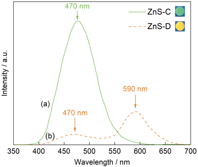| Fig.5 PL spectra of ZnS ceramics under 365 nm UV excitation at room temperature (Insert: luminous samples) |