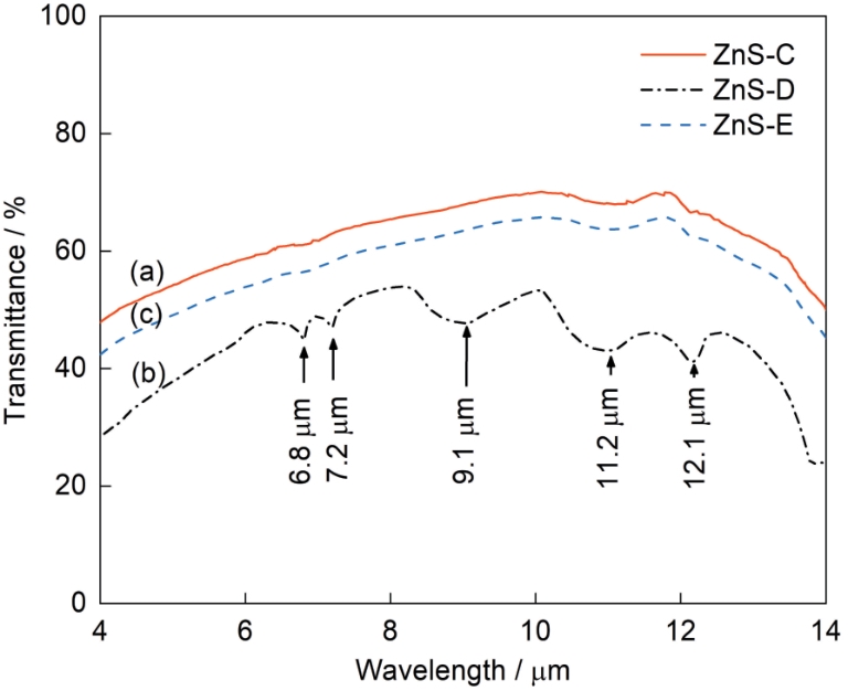 | Fig.6 IR spectra of as-sintered ZnS transparent ceramics (a) ZnS-C, (b) ZnS-D, (c) ZnS-E |
