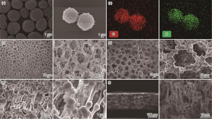 SEM images (a) and EDS spectrum (b) of mesoporous spherical g-C3N4, SEM image of multi-channel PVDF-HFP (c), SEM images of PHCN-3 (d) showing the fibrillated structure (e) and cross-sectional view (f)