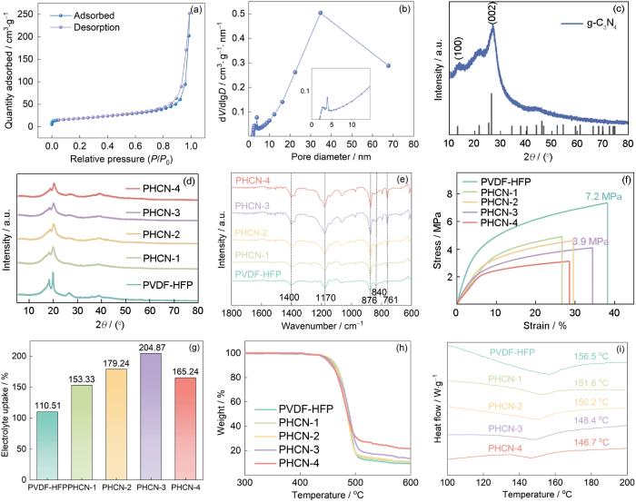N2 adsorption-desorption isotherm (a) and pore size distribution (b) of mesoporous spherical g-C3N4, XRD pattern of mesoporous spherical g-C3N4 (c), XRD patterns (d), FTIR spectra (e), stress-strain curves (f), liquid electrolyte uptake (g), TG analysis (h), and DSC analysis (i) of PHCN-X and PVDF-HFP