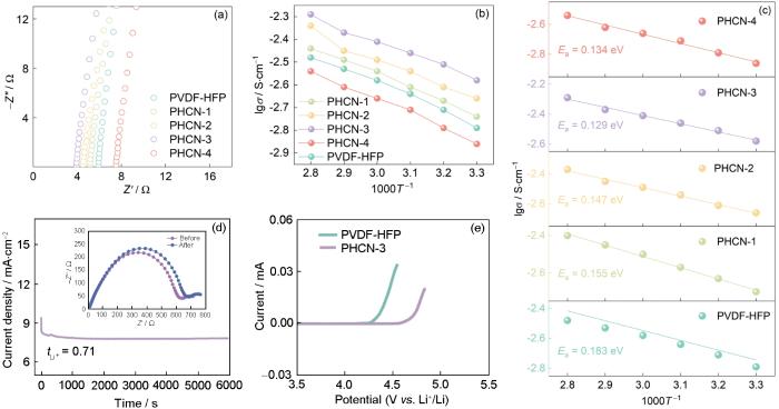 Nyquist plots at 30 oC (a), Arrhenius plots (b), activation energy plots (c), chromoamperometry curve and corresponding Nyquist plots before and after polarization for PHCN-3 at 30 oC (d), LSV curves of PHCN-3 and PVDF-HFP quasi-solid electrolytes at 30 oC with a scan rate of 10 mV·s-1 (e)