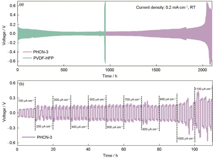 Galvanostatic cycling profiles of Li symmetric cells assembled with PVDF-HFP and PHCN-3 (a), and critical current density (CCD) curve for PHCN-3 (b)