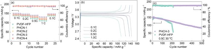 Rate performance (a) and initial charge-discharge curves at various C-rates (b) for the LiFePO4/PHCN-3-LiPF6/Li cell, Cycling stability of PHCN-3 and PVDF-HFP at 0.5C and 30 oC (c)