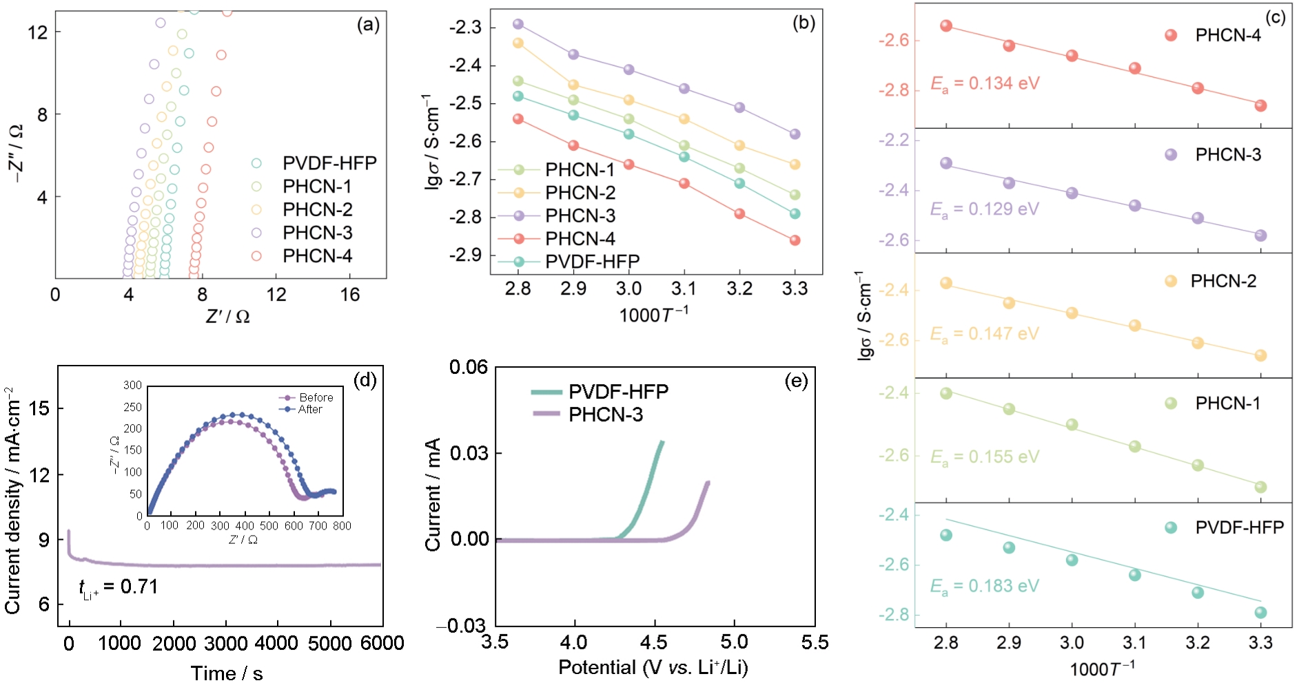 | Fig.4 Nyquist plots at 30 oC (a), Arrhenius plots (b), activation energy plots (c), chromoamperometry curve and corresponding Nyquist plots before and after polarization for PHCN-3 at 30 oC (d), LSV curves of PHCN-3 and PVDF-HFP quasi-solid electrolytes at 30 oC with a scan rate of 10 mV·s-1 (e) |