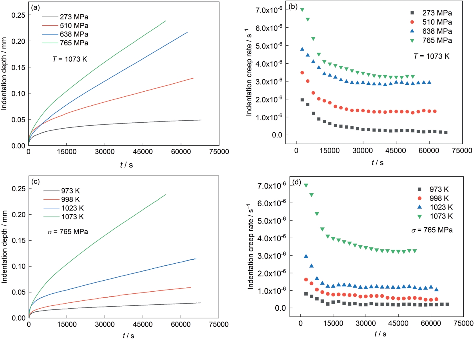 | Fig.2 Indentation depth-time (a, c) and indentation creep rate-time (b, d) curves for Sanicro25 steel at different stresses (a, c) and different temperatures (b, d) |