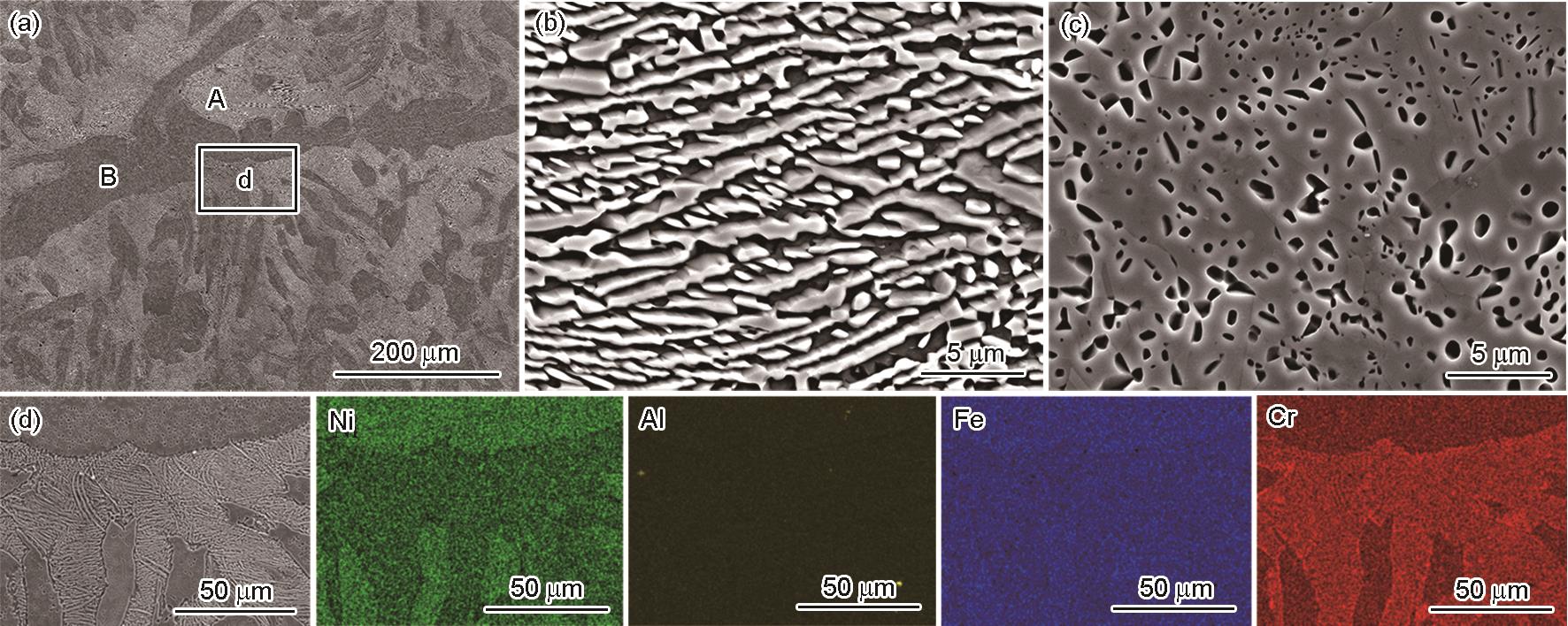 | Fig.2 SEM micrographs of CA alloy (a) low magnification SEM picture, (b) high magnification of the region A in (a), (c) high magnification of region B in (a), (d) high magnification SEM micrograph and the corresponding EDS elemental maps of region d in (a) |