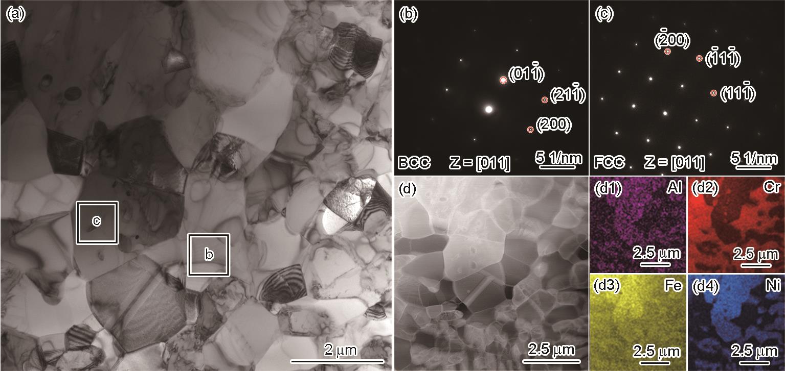 | Fig.4 TEM images of the recrystallized region in the CA alloy (a) BF image of region B in Fig.2a, (b) SAED pattern of BCC grains, (c) SAED pattern of the FCC matrix, (d) HAADF-STEM image of region B in Fig.2a with corresponding elemental distribution mapping |