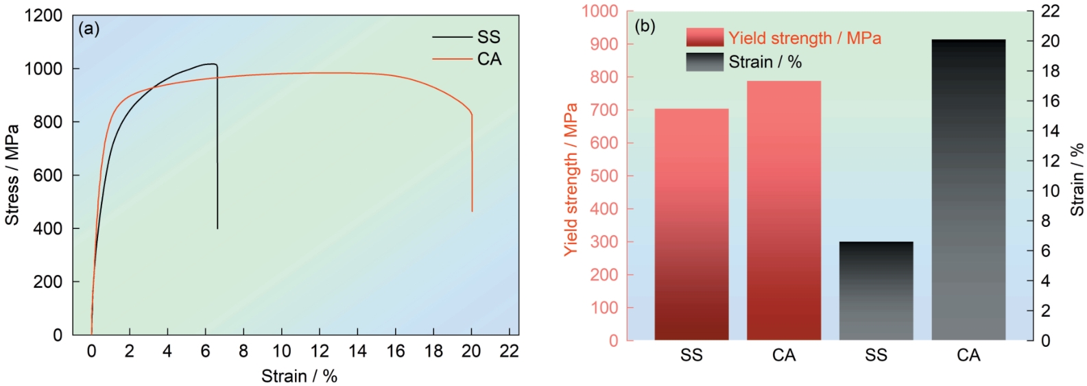 | Fig.6 Room-temperature tensile stress-strain curves of the two alloys (a) and comparison of the yield strength and elongation of the two alloys (b) |