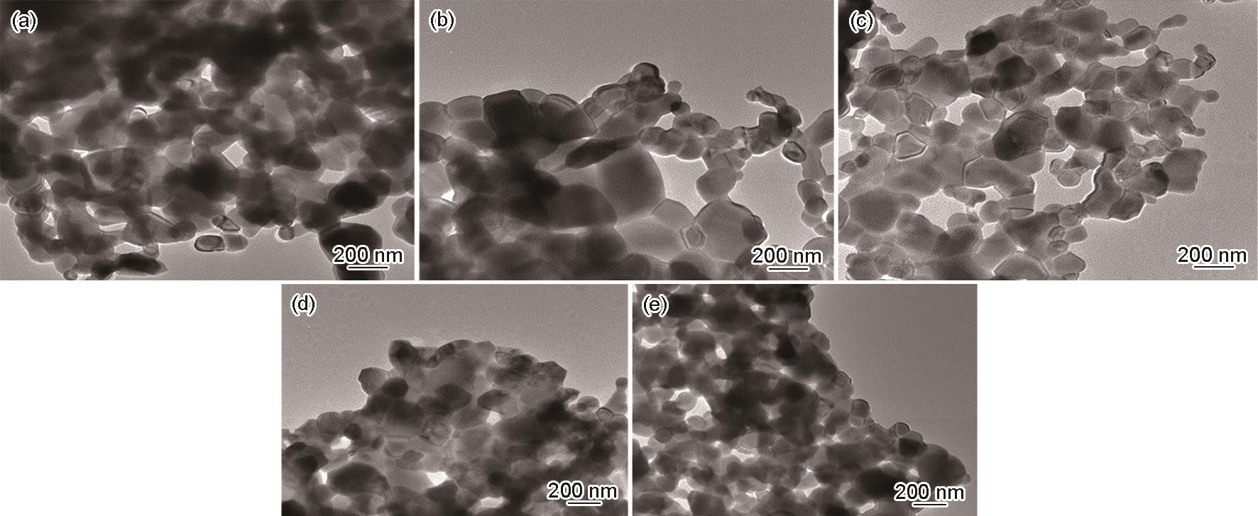 | Fig.2 TEM plot of different doping ratios of Ni2+ and Co2+(a) Ni0.1Co0.9Fe2O4, (b) Ni0.3Co0.7Fe2O4, (c) Ni0.5Co0.5Fe2O4, (d)Ni0.7Co0.3Fe2O4, (e) Ni0.9Co0.1Fe2O4 |