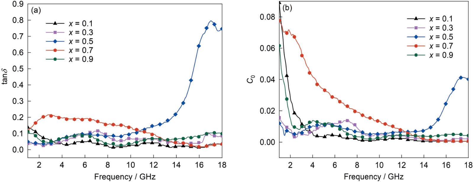 | 图5 Ni x Co1 - x Fe2O4样品的tanδ、C0和频率曲线 |